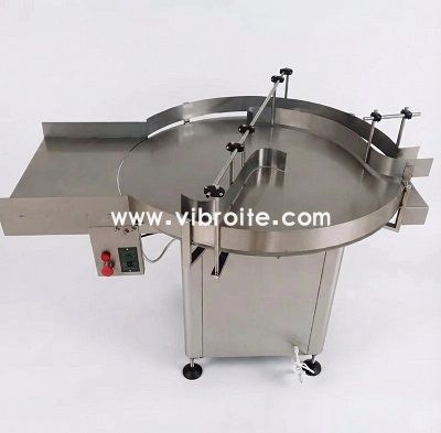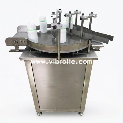 This Automatic Rotary Infeed Turntable Machine is designed and manufactured by Suzhou Vibrant Automation Co., Ltd under the Vibroite brand. It is mainly used for buffering, accumulating, and stable feeding of bottles and jars before filling, labeling, or capping processes, serving as an essential auxiliary unit in automated bottling lines.